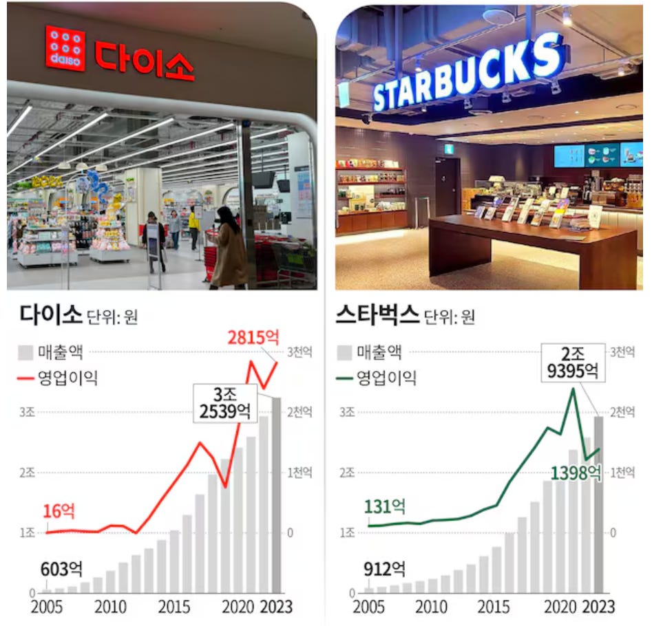 - 24년은 다이소가 대략 4조를 했다는 이야기가 많이 돌고 있고, 스타벅스의 매출과 다이소를 비교해보면 다이소의 존재감이 느껴집니다. 다이소는 이미 스타벅스의 매출 액을 넘었고, 스타벅스보다 영업이익도 잘나오고 있는 상황입니다.