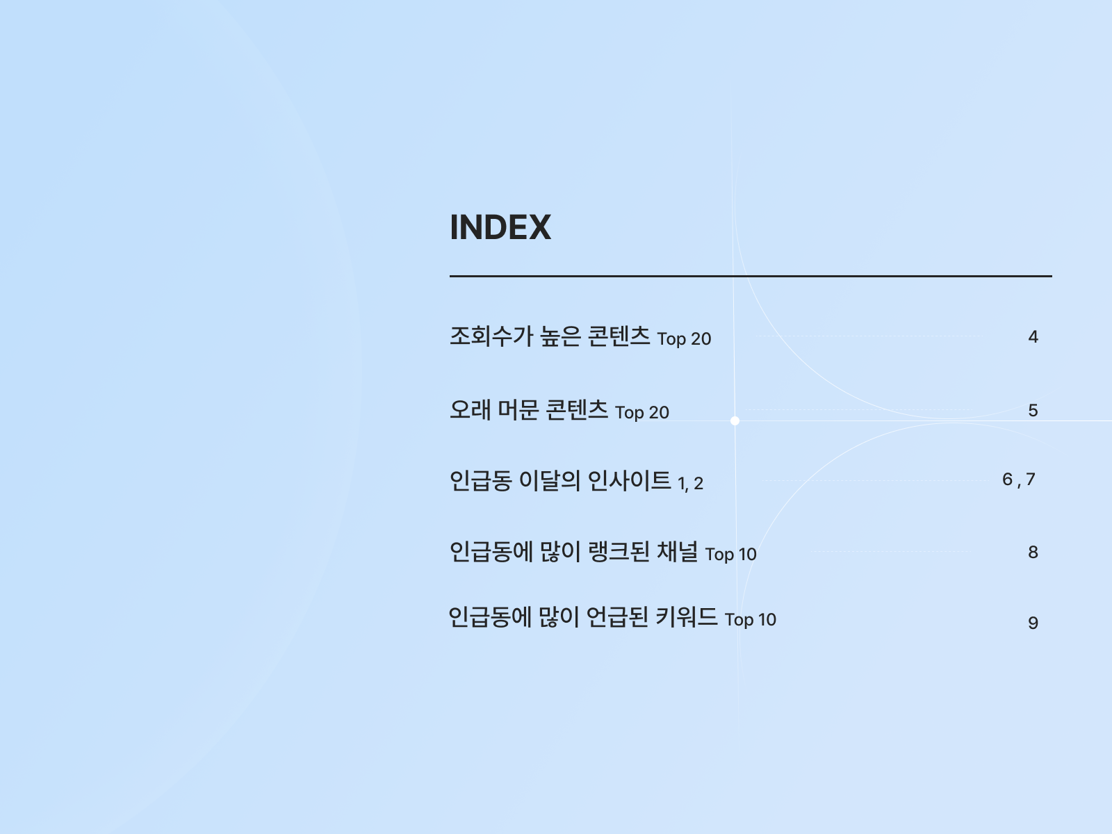 이러한 매월의 인급동에 대한 데이터를 총 망라하여, 마케터 여러분들께 유튜브에 대한 트렌드와 인사이트를 전달할 수 있기를 바랍니다.