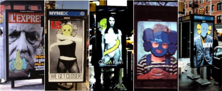 그러던 어느 날, 친구가 비밀 하나를 털어놨다. 뉴욕의 공중전화 부스 광고판을 열 수 있는 열쇠를 가지고 있다는 사실이었다. 그렇게 카우스는 공중전화 부스와 버스정류장에 설치된 광고물을 떼와 자신의 캐릭터를 그려 넣기 시작했다. DKNY, 캘빈클라인, 게스 등 브랜드도 다양했다.