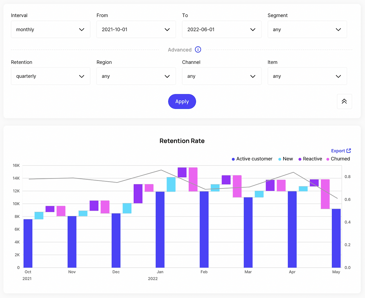 메이크대쉬의 클라이언트 중 식료품 구독 서비스를 제공하는 곳이 있어요. 구독 상품의 구매 주기가 30일이기 때문에 해당 클라이언트는 리텐션을 Monthly - Monthly 차트로 확인하고 있어요.
