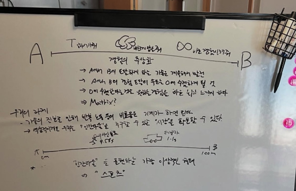 앉아있다가 한번씩 생각의 꼬리를 물곤 하는데 어느 날 문득 칠판에 뭔가 휘갈겼다. AI 시대라는데 왜 난 스포츠에 집중하고 있지?