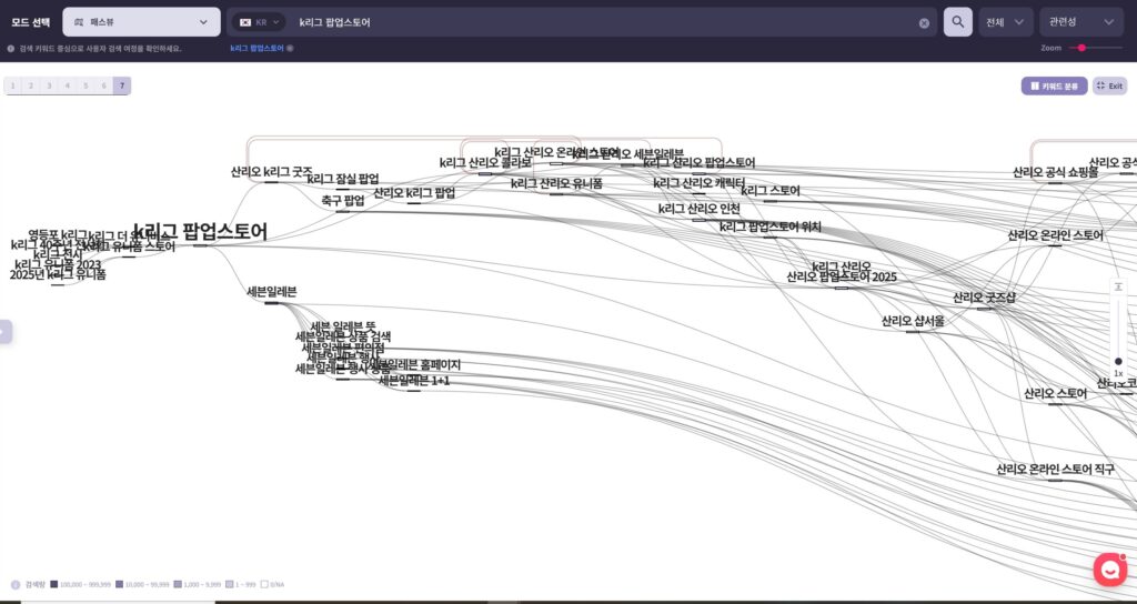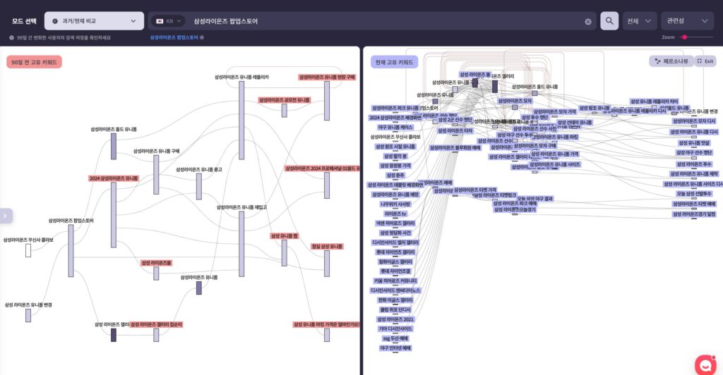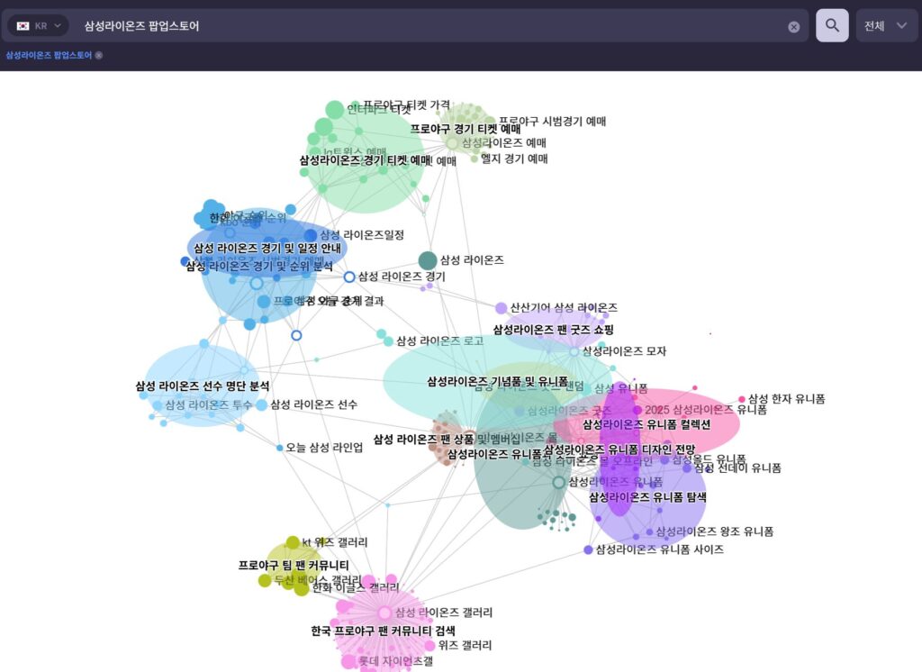 이처럼 하나의 키워드(예: 삼성라이온즈 팝업스토어)를 중심으로 연관된 검색 키워드들을 그룹핑해보면, 소비자들이 어떤 맥락과 주제에서 정보를 탐색하는지 보다 선명하게 확인할 수 있습니다.