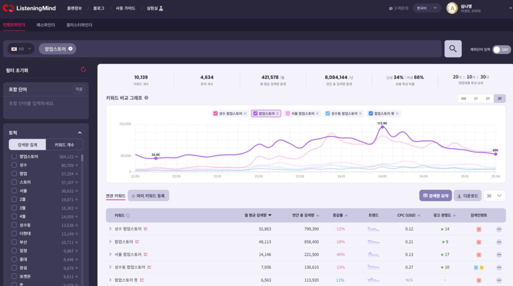 ‘성수 팝업스토어’, ‘서울 팝업스토어’, ‘성수동 팝업스토어’ 등 지역명을 포함한 키워드들이 상위에 포진해 있어, 성수가 팝업스토어의 핵심 거점으로 인식되고 있음을 데이터에서도 확인할 수 있었습니다.