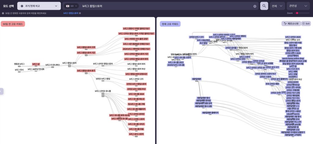 특정 마케팅 · 캠페인 전후의 검색 경로를 비교해보면, 소비자들의 인식 변화와 브랜드 유입의 실마리를 발견할 수 있습니다. 예를 들어, ‘K리그 팝업스토어’의 경우, 90일 전에는 유니폼, 가격, 기간 등이 중심이었다면, 현재는 ‘산리오 굿즈’, ‘산리오 스토어’, ‘K리그 콜라보’ 등으로 관심이 이동했습니다.