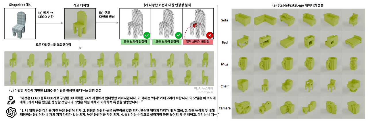 - ShapeNetCore์ ํฌํจ๋ 3D ๊ฐ์ฒด ๋ฐ์ดํฐ๋ฅผ 20ร20ร20 ๊ท๊ฒฉ์ ๋ง๋ ๋ ๊ณ ๋ธ๋ฆญ์ผ๋ก ๋ฐ๊พธ๋ โlegolizationโ ๊ณผ์ ์ ๊ฑฐ์น๋ค(a). ์ด ๊ณผ์ ์ ํตํด ์์ ๋ก์ด 3D ๋ชจ๋ธ์ ๋ ๊ณ ์ฒ๋ผ ๊ท๊ฒฉํ๋ ๋ธ๋ฆญ ๊ตฌ์กฐ๋ก ๋ฐ๋๋ฉฐ, ๋ธ๋ฆญ์ ํฌ๊ธฐ์ ๋ฐฉํฅ๊น์ง ํจ๊ป ๊ฒฐ์ ๋๋ค(b).