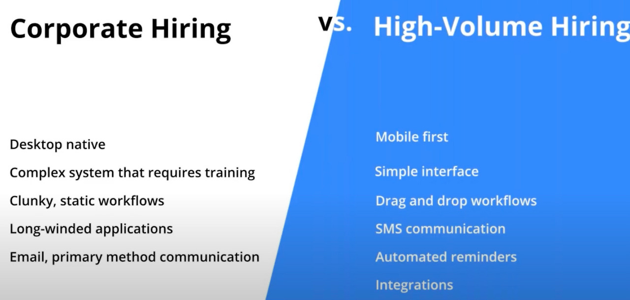 위 자료는 Fountain에서 발표한 자료에서 스크린샷이다. 좌측에 있는 Corporate Hiring이 우리가 통상적으로 익숙한 채용 과정에 유사하고, 우측에 있는 항목들이 High-Volume Hiring에 해당하는 특성이다.