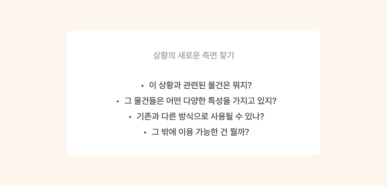 작가는 상황의 새로운 측면을 찾을 때, 다음과 같은 질문을 던져보라고 한다. 나는 이걸 디자이너의 관점에서 다시 생각해봤다.