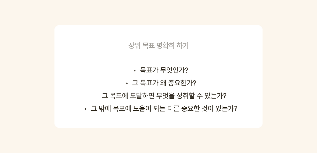 - 그 목표가 왜 중요한가? 그 목표에 도달하면 무엇을 성취할 수 있는가?