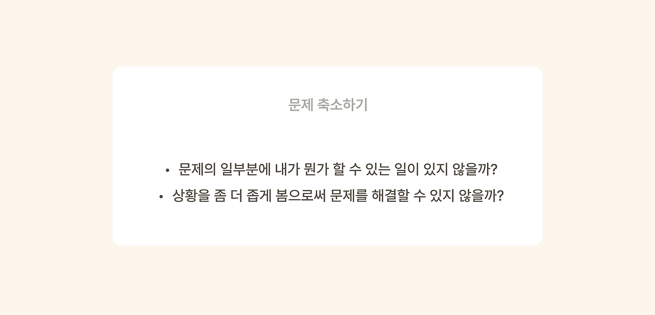 문제가 아무리 커 보여도 내 수준에서 할 수 있는 것이 무엇일지 먼저 생각해 보아야 한다. 즉, 문제를 축소해 보아야 한다.