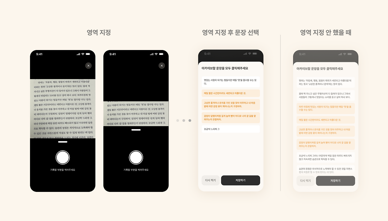 이전에 북카이브의 문장 선택 단계 UX를 개선했던 것도 이와 유사한 맥락이다. 책을 스캔하는 과정에서 AI 텍스트 인식 성능이 낮다 보니 변환된 텍스트가 실제 책 속 텍스트와 다르게 표시되었다. 그러다보니 사용자들이 기록할 부분을 찾는 데 시간이 오래 걸리는 문제가 있었다. 물론 근본적인 해결책은 성능을 높이는 거다. 하지만 당시에 성능을 드라마틱하게 높이는 데는 한계가 있었고, 리소스도 많이 드는 일이었다. 그래서 문제를 쪼개 더 작게 해결할 수 있는 방법을 고민했다.