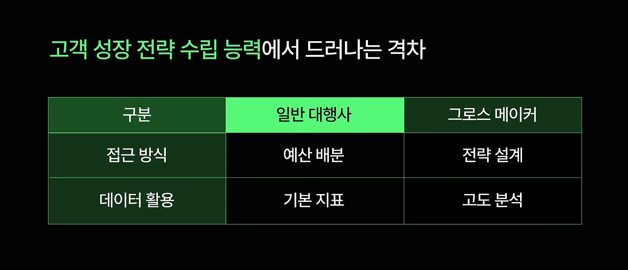이런 차이는 단순한 업무 범위의 문제가 아닙니다. 사고하는 깊이와 접근하는 방식 자체가 근본적으로 다른 것입니다. 일반 대행사에서는 주어진 예산을 어떻게 효율적으로 소진할지에 집중하지만, 그로스메이커의 Growth PM은 투자 유치가 필요한 회사일 경우, 다음 투자 라운드를 성공시키기 위해 지금부터 어떤 지표를 어떻게 만들어가야 할지를 전략적으로 설계합니다.