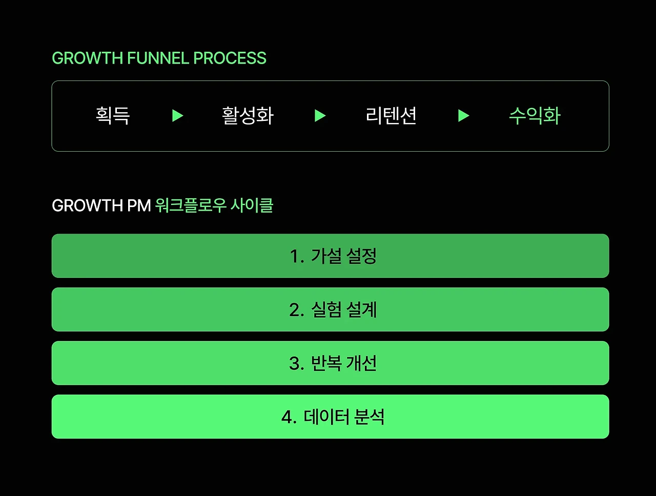 GPM은 주로 고객 획득(Acquisition)과 활성화(Activation) 등 전반적인 퍼널 최적화와 개선에 집중합니다. 새로운 사용자를 제품으로 유입시키는 방법(랜딩페이지, 추천 프로그램)부터 유입된 사용자가 제품의 핵심 가치를 경험하고 지속 사용하도록 만드는 아하! 모멘트를 찾는 것에도 집중하는 데, 성장 구조를 만들기 위해선 획득과 활성화 퍼널에서 초기 단기적 전략이 필요하기 때문입니다.