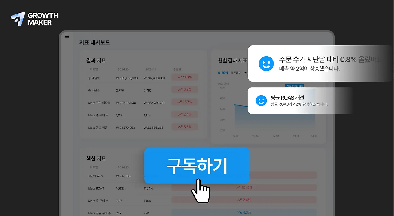 ROAS나 클릭 수 같은 단순 퍼포먼스 마케팅 지표에 머무르는 건 단편적입니다. 비즈니스 성장에 직결되는 지표 중심으로 마케팅 전략을 짜는 게 훨씬 중요해지죠. 특히 그로스메이커는 고객 획득 비용(CAC)과 고객 생애 가치(LTV)를 비교, 분석하는 “지속 가능한” 성장 모델을 설계합니다.