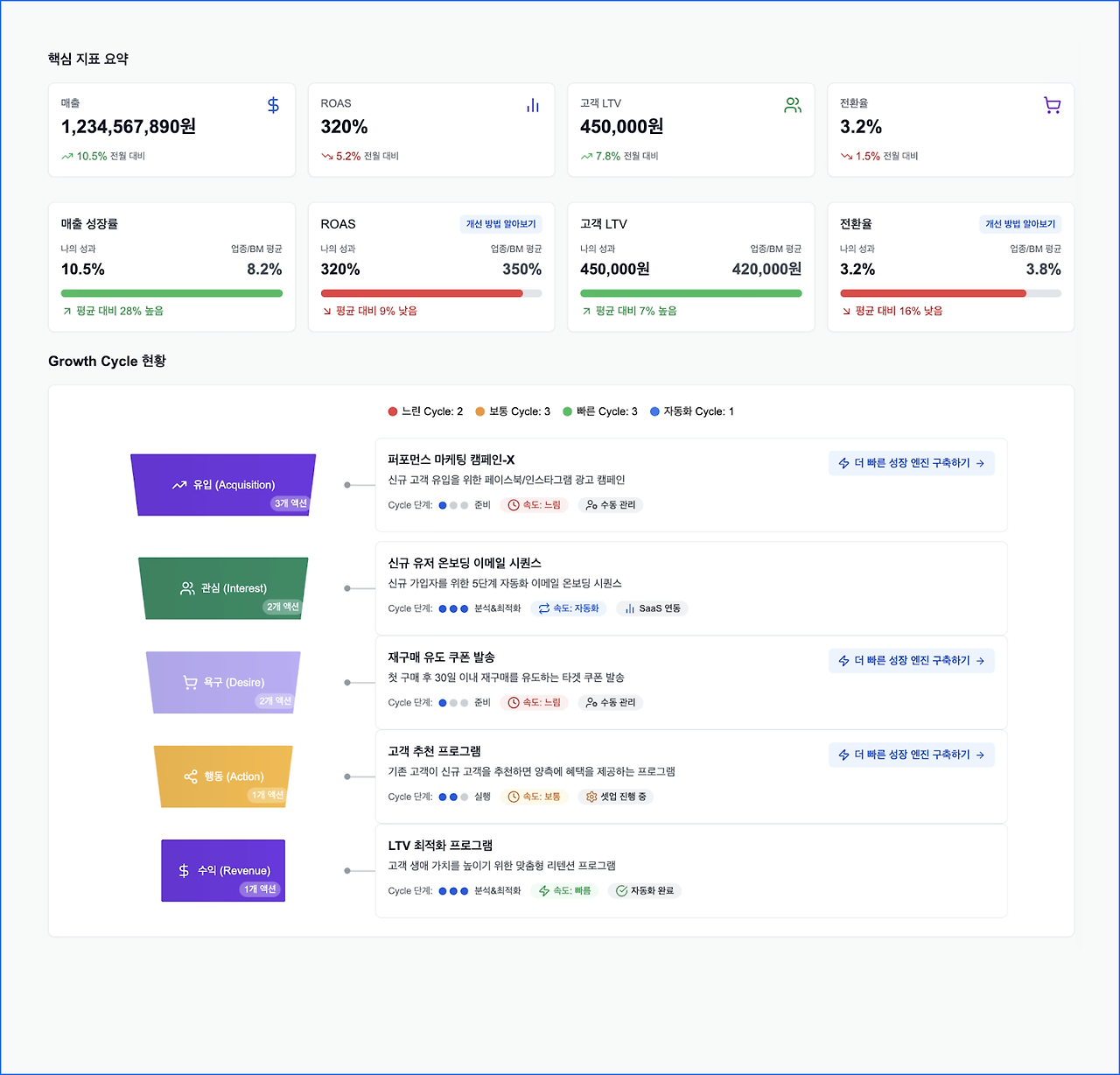 - 단기 성과(CAC, 전환율)와 장기 성과(LTV, 재구매율) 균형을 위한 대시보드 구축