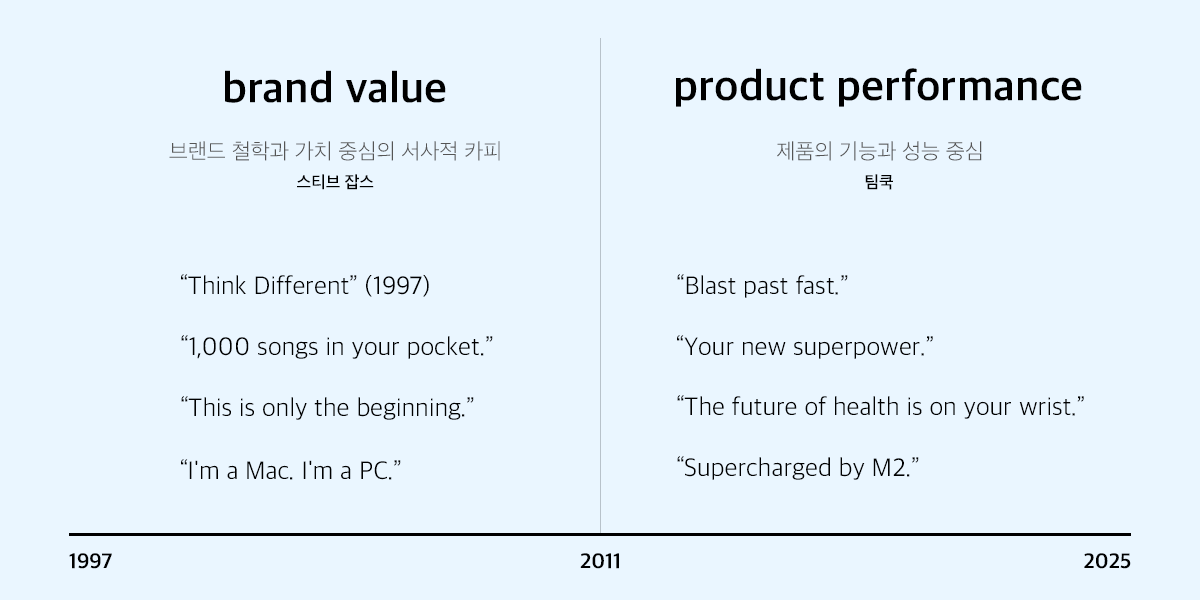 스티브 잡스 시절의 애플 광고는 브랜드 철학과 가치 중심의 서사적 카피를 구사했고, 그 이후의 애플 광고는 점차 제품의 기능과 성능 중심으로 옮겨갔다. 애플이 한때 “왜 우리는 존재하는가?”에 집중했다면, 지금은 “이 제품으로 무엇을 할 수 있는가?”로 포커스를 옮겼다는 변화를 명확히 보여준다.