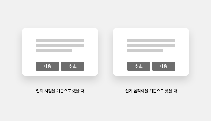 내가 해왔던 패턴은 인지 시점을 기준으로 한다. 행동을 유도하는 버튼을 인지 시점의 맨 앞에 위치하는 방식이다. 예를 들어 하단 이미지를 보자. 다음과 취소 둘의 버튼 위치는 서로 다르지만 뭐가 맞고 뭐가 틀린지에 대한 것은 기준에 따라 다를 뿐이다.