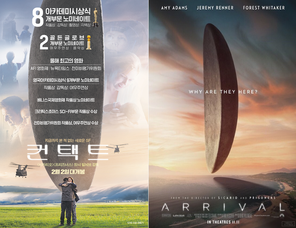 국내에 개봉하는 외국 영화들의 포스터는 개봉하는 지역의 정서를 반영해 현지화된다. 왼쪽의 이미지는 2017년 Arrival의(컨택트) 국내 개봉 당시 포스터이고, 오른쪽은 북미 개봉 포스터다. 복잡함은 무질서이고 단순함은 질서다. 왼쪽의 복잡한 비주얼은 이해하기 어렵다. 하지만 오른쪽의 단순한 비주얼은 이해하기 쉽다.