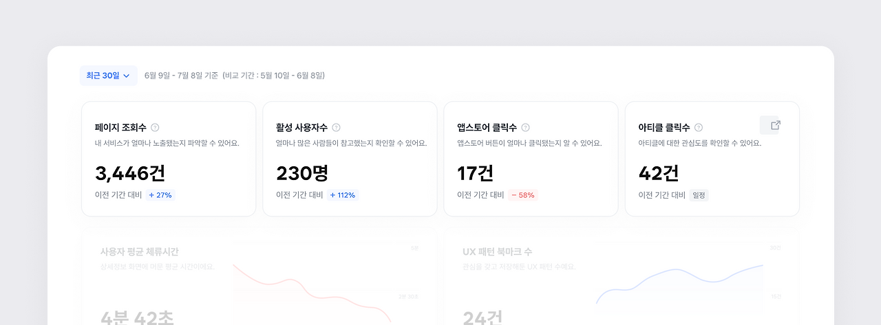 서비스 전체 흐름을 요약해서 파악할 수 있어요. 설정한 날짜 기준으로, 과거 동일 기간 대비 변화 추이를 한눈에 보여줘요.