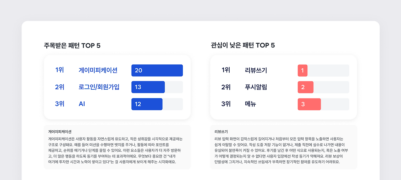 클릭 수 기준으로 주목 받는 패턴 TOP 5와 관심이 낮은 패턴 TOP 5를 함께 제공해요. 클릭이 적은 UI는 사용자가 관심을 갖지 못했거나, 사용이 불편했을 가능성이 높아요.