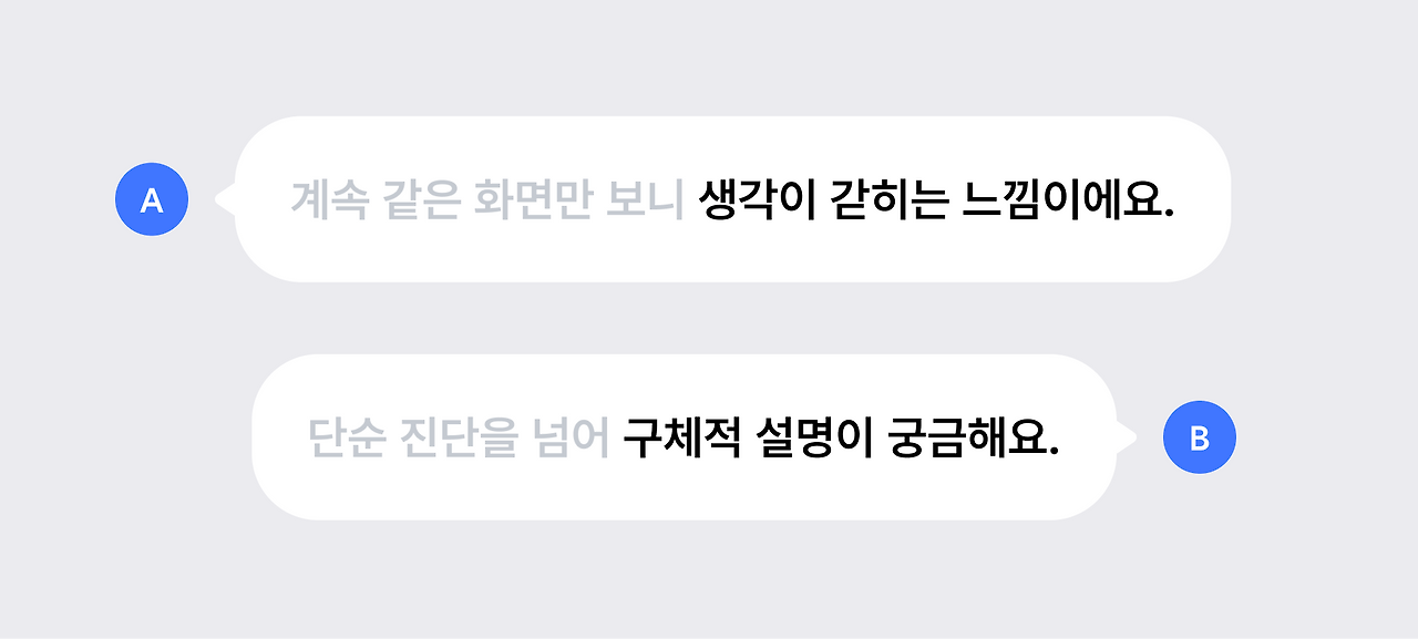 실제 고객의 니즈를 확인하기 위해 스타트업 디자이너, 기획자, 대표, UX 연구원 등 5인을 대상으로 인터뷰를 진행했습니다. 특히 서비스 개선 경험에서 겪은 어려움, 경쟁사 분석 방식, 대시보드 MVP에 대한 기대치 및 피드백을 중심으로 깊이 있게 질문했습니다. 그 결과 “계속 같은 화면만 보니 생각이 갇히는 느낌이다” 페인포인트를와 “단순 진단을 넘어 구체적 설명이 필요하다”는 등 니즈를 확인할 수 있었습니다.