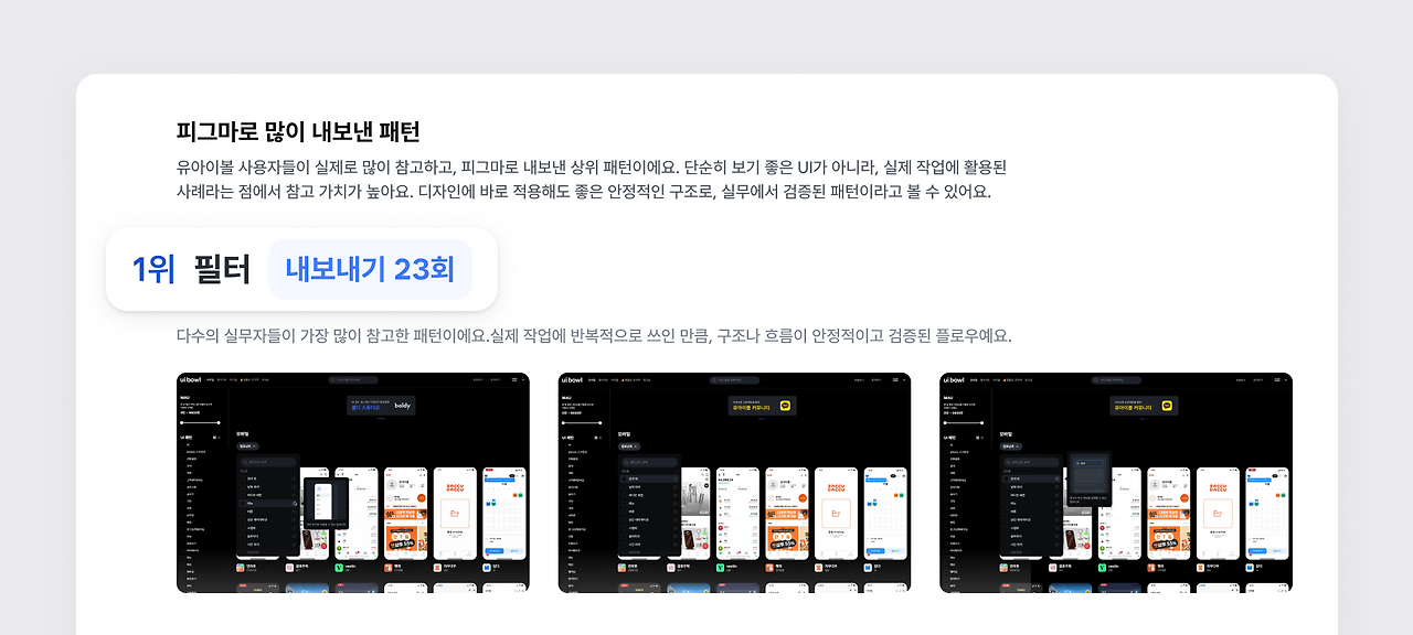 UX 패턴 북마크 수: 다른 사용자들이 디자인 참고용으로 저장한 UX 패턴이에요. 많이 저장된 UI일수록 검증된 디자인일 가능성이 높아요.