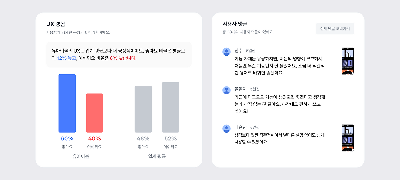 좋아요 / 아쉬워요 평가와 함께 남긴 댓글을 통해 각 UI 패턴에 대한 직접적인 사용자 목소리를 확인할 수 있어요.