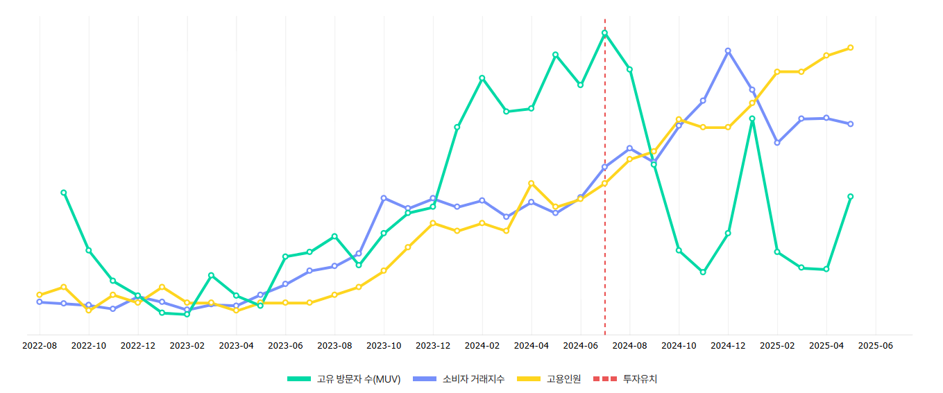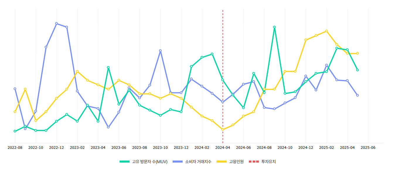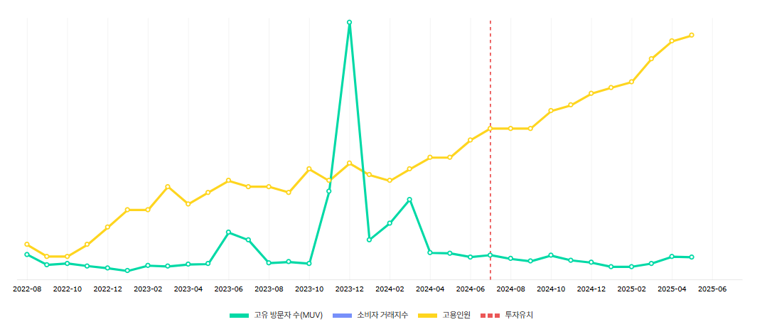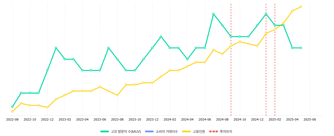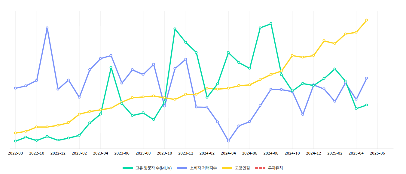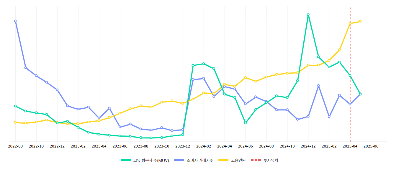 혁신의숲에서는 고용인원 외에도 소비자 거래액, 고유방문자수, 투자 유치 소식 등 다양한 관점에서 기업의 성장을 입체적으로 분석할 수 있는 지표들을 함께 제공하고 있습니다. 혁신의숲을 통해 단일 지표가 아닌, 여러 지표 간의 상관관계를 파악해보세요! 감사합니다.