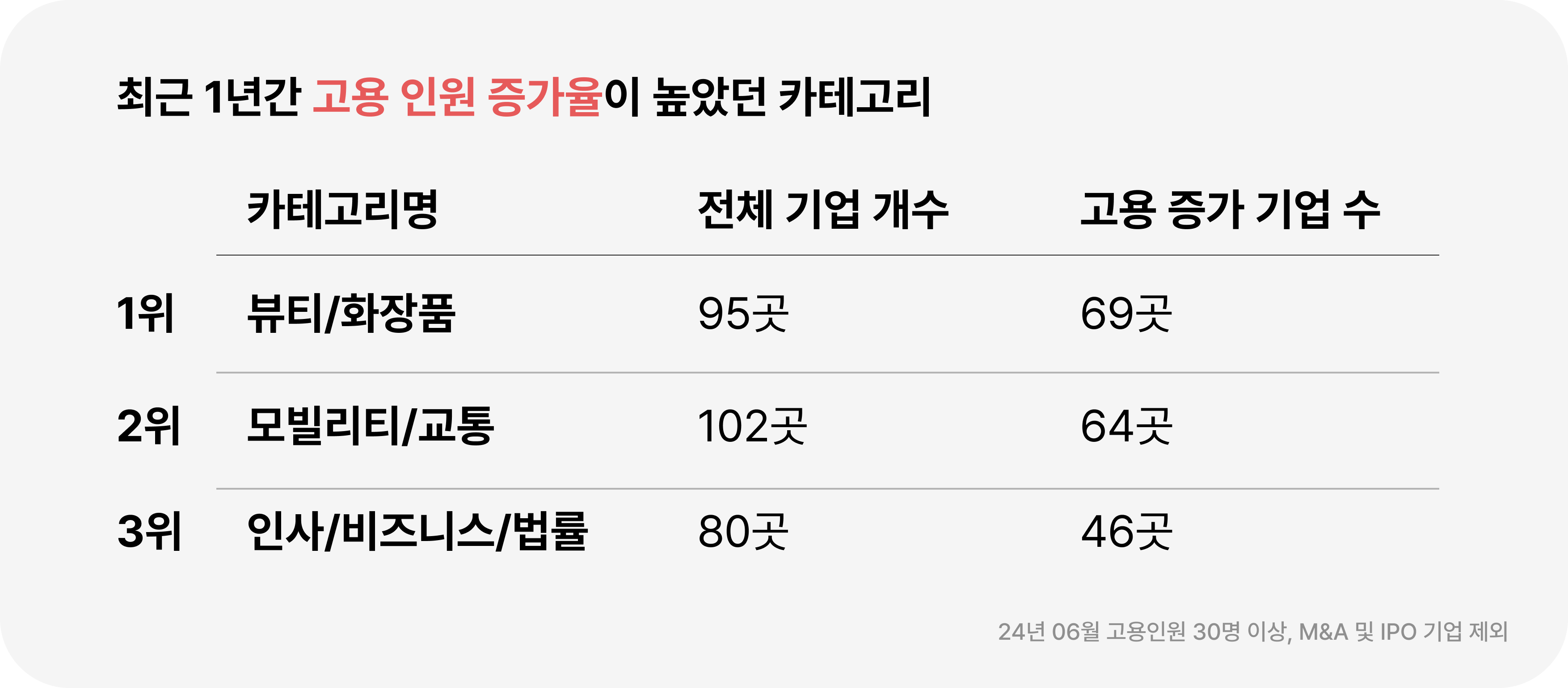 2024년 6월 고용인원과 2025년 5월 고용인원을 바탕으로 집계한 결과, 고용 증가 비율이 가장 높았던 카테고리는 뷰티/화장품이었으며, 그 뒤를 이어 모빌리티/교통, 인사/비즈니스/법률 카테고리가 각각 2위, 3위를 기록했습니다. 이번 분석리포트에서는 고용 증가 비율이 높았던 상위 카테고리 TOP3 소개, 그리고 그 안에서 특히 고용이 활발했던 대표 스타트업 6곳을 함께 소개합니다.