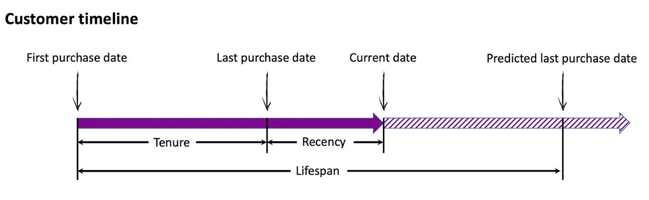 Lifespan (고객 생애 기간): 첫 구매일부터 ‘예상되는’ 마지막 구매일까지의 일수. 현재 고객은 아직 마지막 구매일을 알 수 없기 때문에, 보통 이탈률을 기반으로 예측합니다.