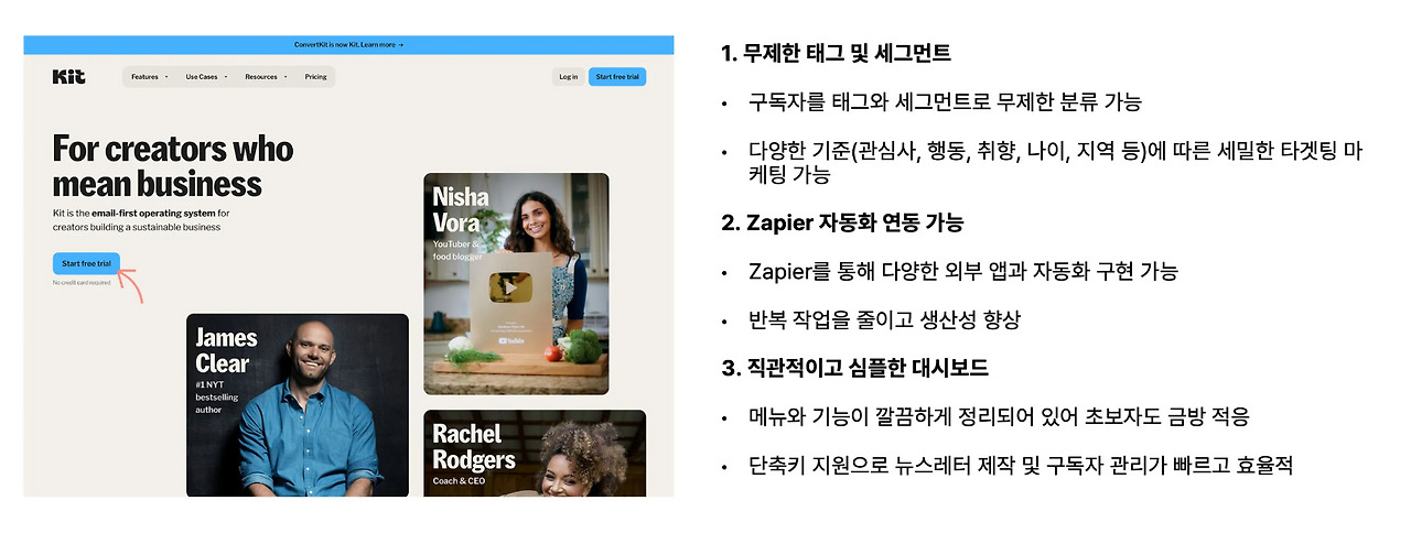 Kit의 Sequence와 Automation을 활용하여 이메일 발송 시스템을 구성하고, Zapier 자동화 플랫폼과 연계하여 새로운 신청자에 대하여 이메일/문자를 전부 자동화할 수 있습니다.