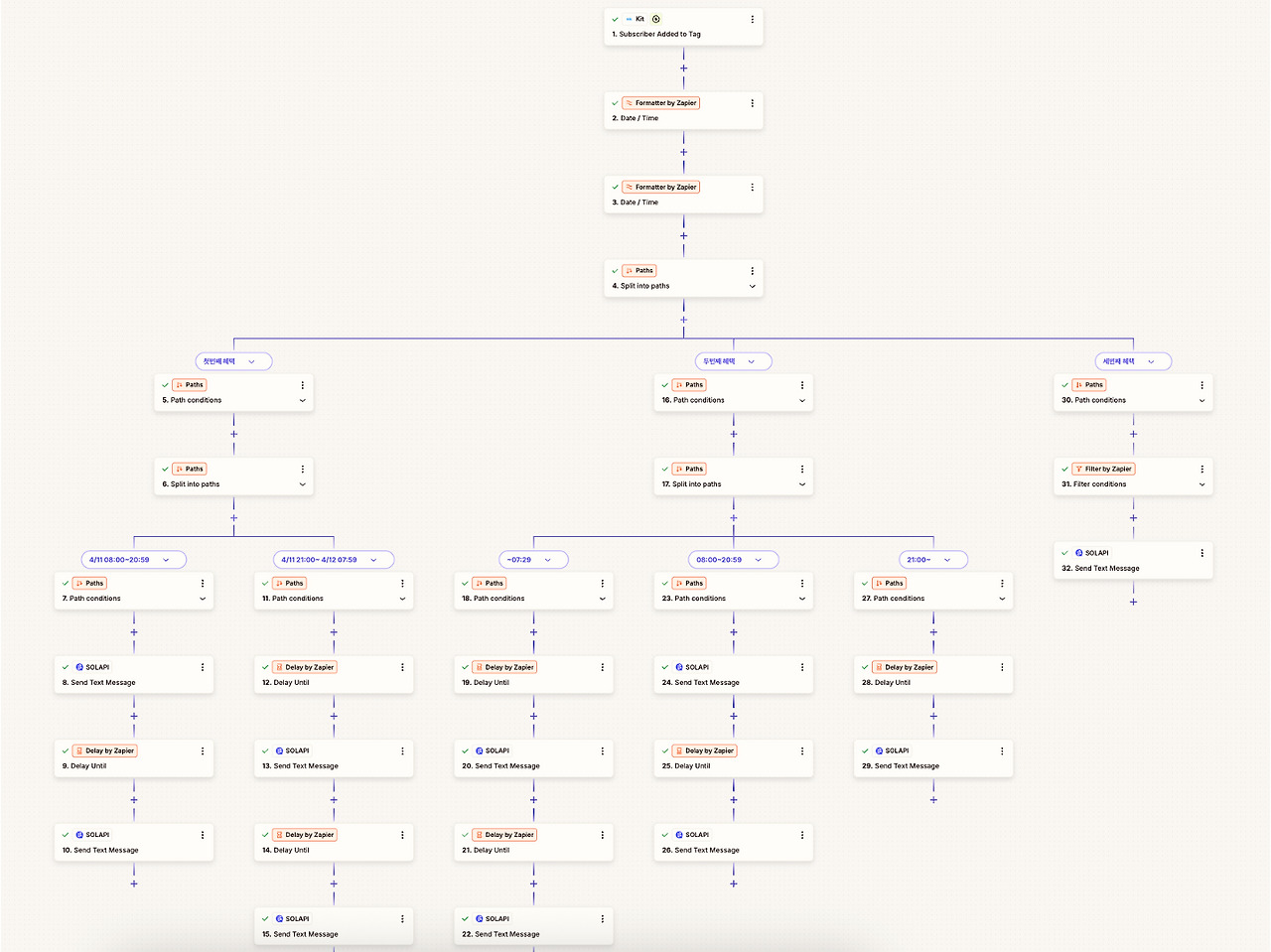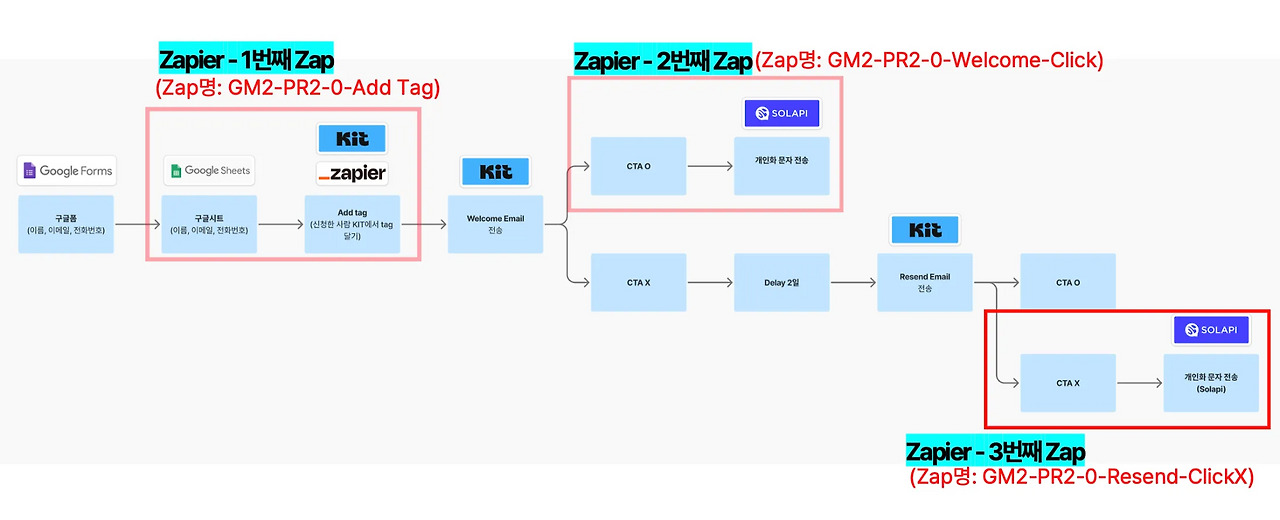 내부적으로는 Kit의 Merge Tag와 Zapier를 활용하여 아래와 같이 시간대 별로 사전 알림 신청을 받아서 미리 설계된 개인화된 이메일과 문자를 보내는 것으로 활용하고 있습니다.