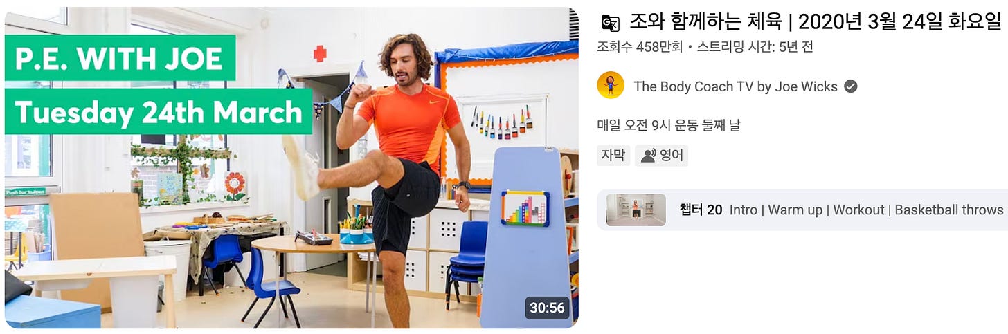 PE with Joe는 영국 정부가 코로나19 봉쇄령을 발표한 직후 시작한 전 세계 최초의 대규모 온라인 라이브 체육 수업이에요.