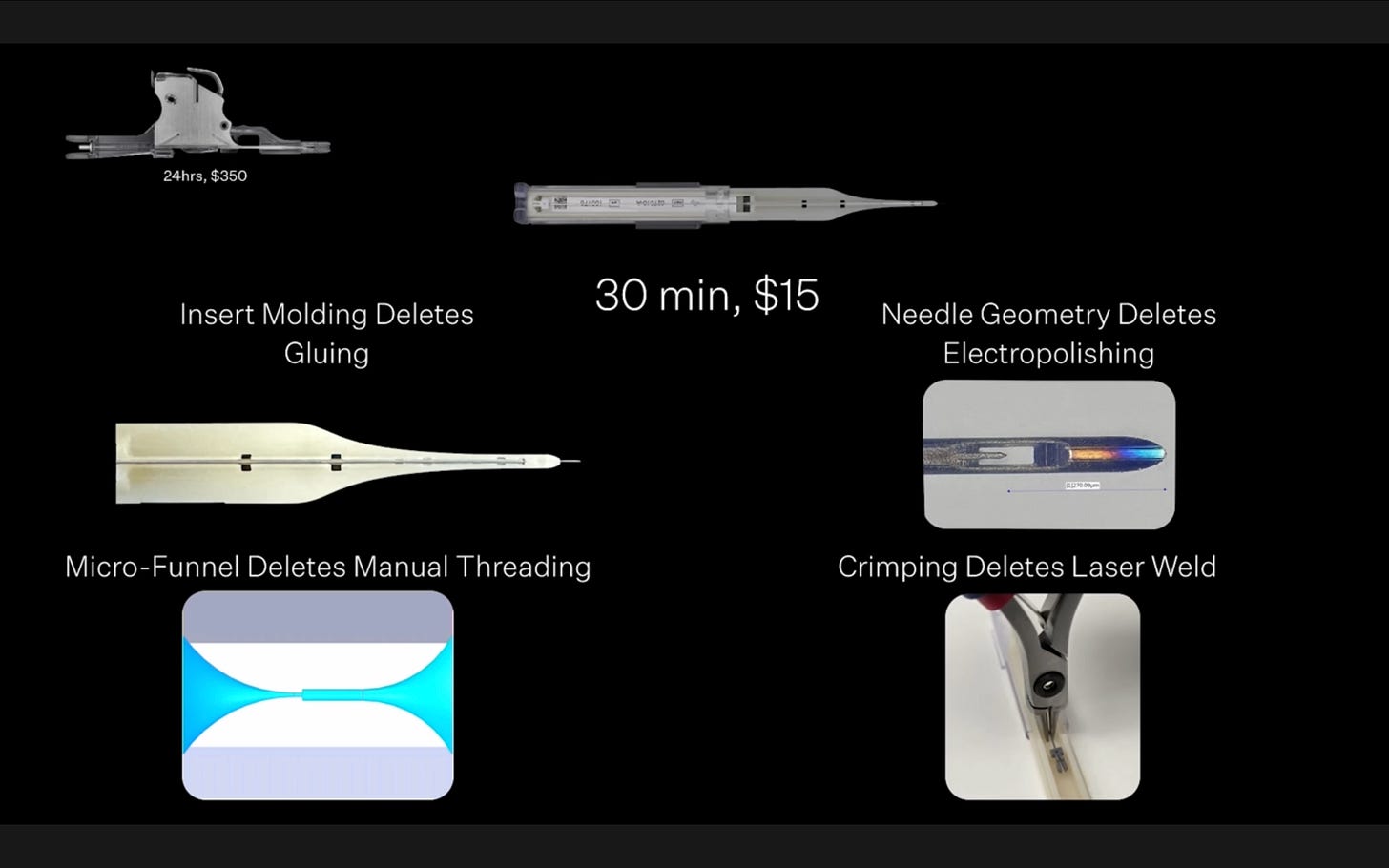 전극 카트리지 제조 공정을 혁신하여 생산 시간을 24시간에서 30분으로, 비용을 350달러에서 15달러로 대폭 절감했습니다.