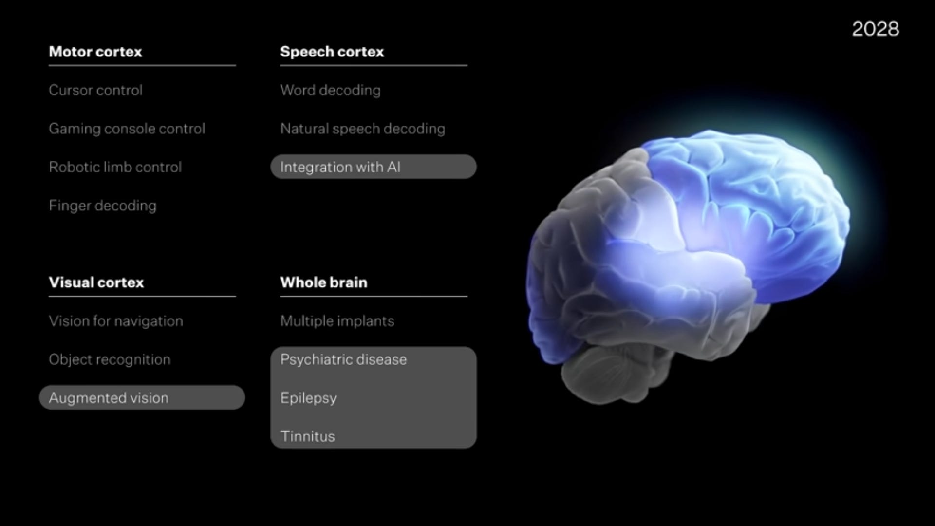 2028년: 임플란트당 25,000개 이상의 채널을 확보하고, 뇌신경질환(정신 질환, 뇌전증 등)에도 접근하여 AI와의 통합을 시연하는 것을 목표로 합니다.