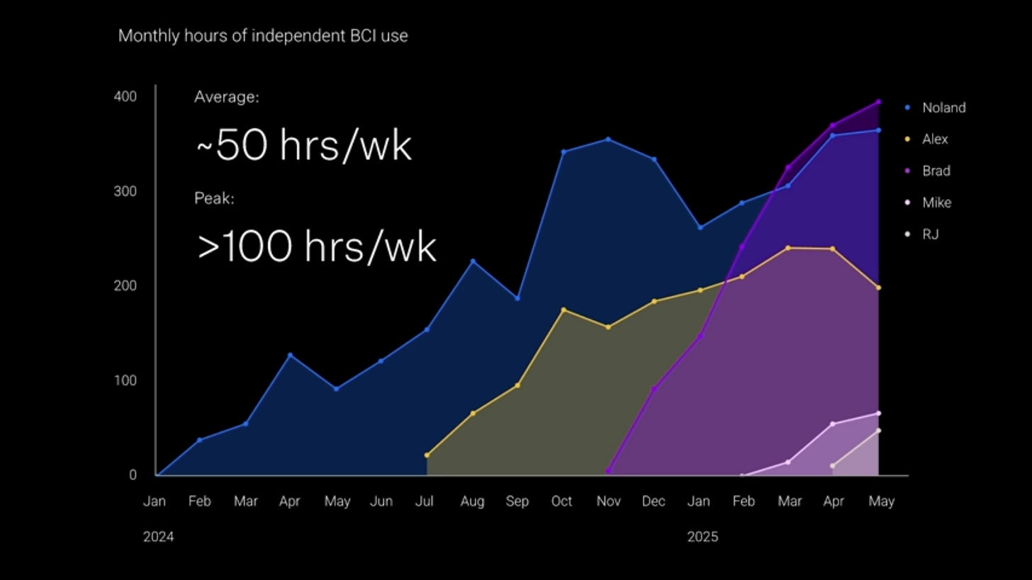 임상 참가자들은 뉴럴링크 BCI를 주당 평균 50시간 이상 사용하며 높은 만족도를 보입니다. 일부 참가자는 주당 100시간 이상 사용하기도 하는데요, 이는 깨어있는 거의 모든 시간 동안 BCI를 활용하고 있음을 의미합니다.