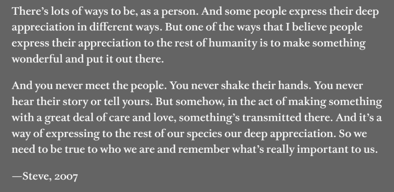 사람으로 살아가는 방식은 참 다양합니다. 그리고 사람들은 저마다 다른 방식으로 세상에 깊은 감사를 표현하죠. 제가 믿기에, 인류의 다른 모든 이들에게 깊은 감사를 표현하는 한 가지 방법은 바로 '경이로운 무언가를 만들어 세상에 내놓는 것'(make something wonderful and put it out there)입니다.