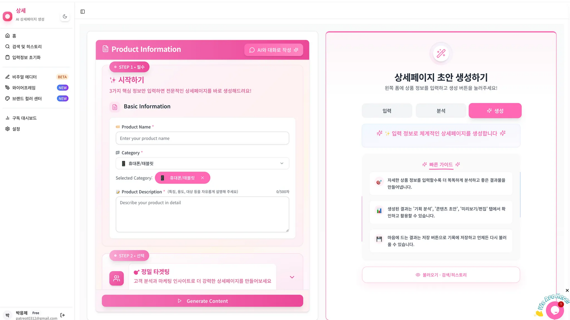 업종 드롭다운 → 직무 선택 → 목적 분류 → 톤앤매너 옵션 → 키워드 입력