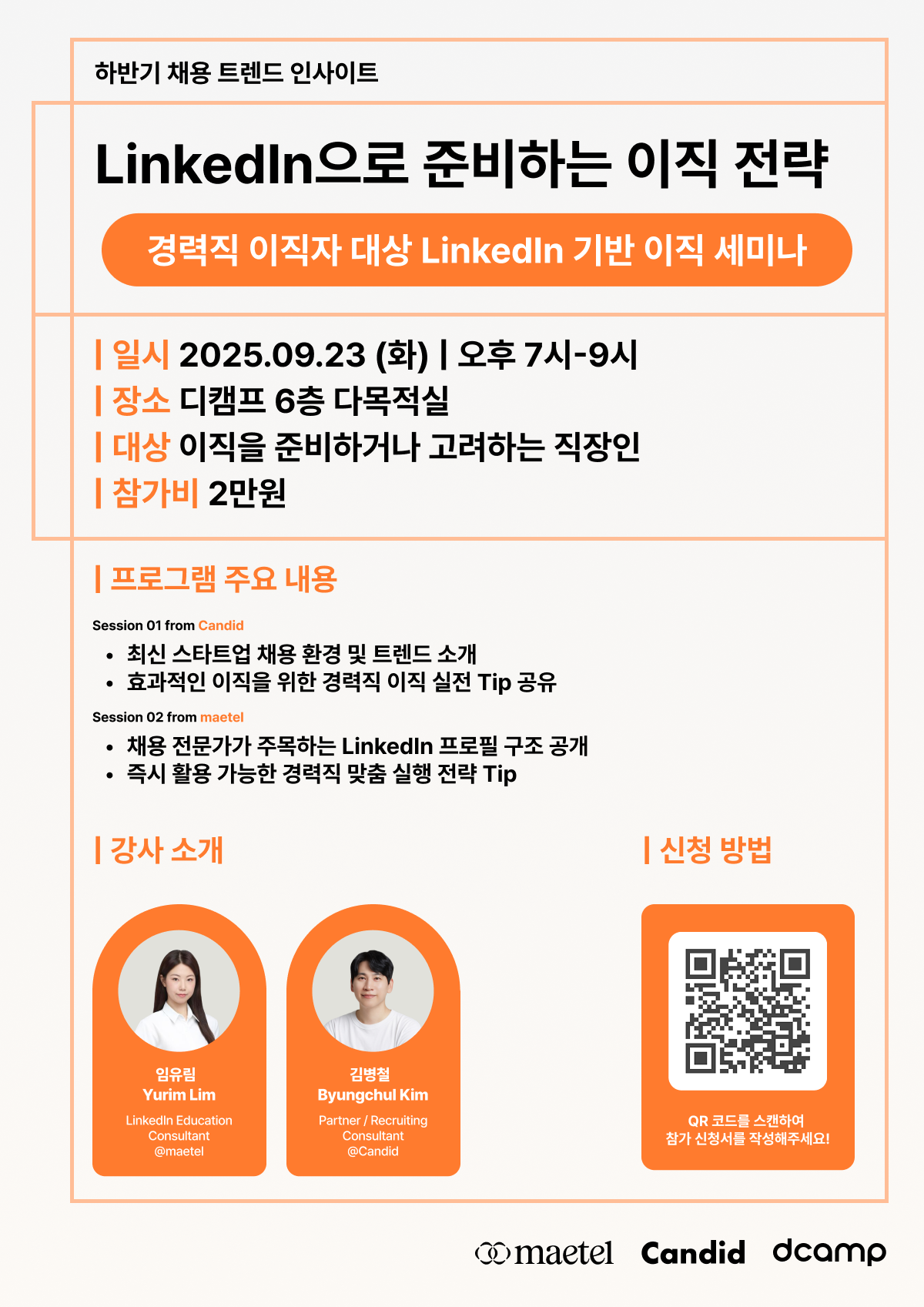 본 세미나는 스타트업 전문 채용 컨설팅사 Candid와 LinkedIn 교육 및 컨설팅 전문 에이전시 Maetel이 함께 준비했습니다.
