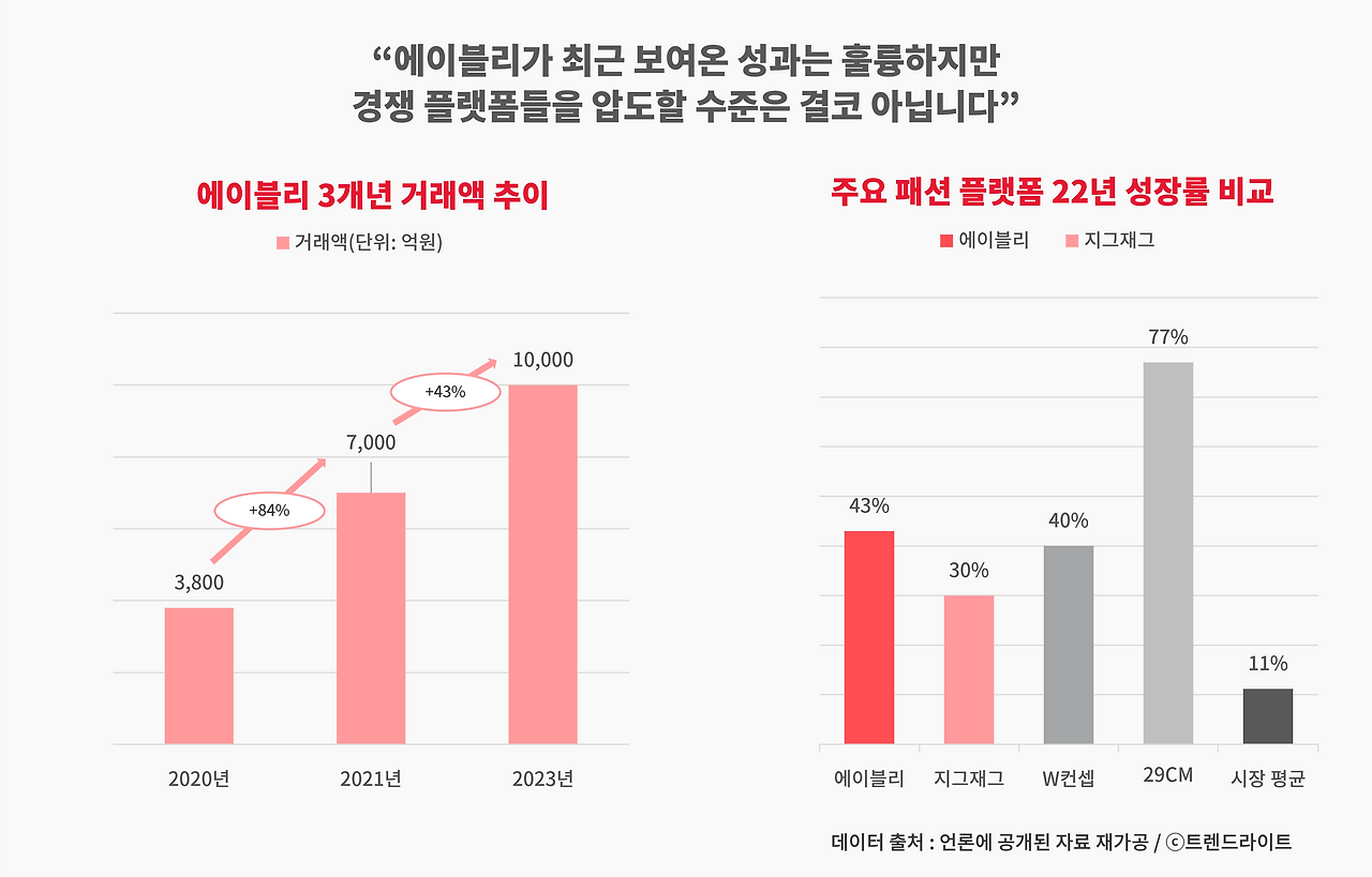 하지만 경쟁사들과 비교하면, 솔직히 에이블리가 보여준 성과가 압도적이라 말하기 뭔가 애매합니다. 우선 가장 강력한 라이벌 지그재그보다는 성장률이 높았던 것 같긴 한데요. 최근 여성 디자이너 패션 브랜드 트렌드에 힘입어 무섭게 크고 있는 29CM에 비하면 절반 수준이고, W컨셉도 비슷한 수준으로 거래액을 키웠기 때문입니다. 특히나 수년 전부터 에이블리와 지그재그는 모두 브랜드 패션을 새로운 성장 동력으로 삼고 있었는데요. 따라서 이와 같은 온라인 편집샵들의 질주가 달가울 리가 없습니다. 동대문 기반으로는 한계가 있고, 브랜드 확장은 경쟁이 점차 치열해지니 고민이 깊어질 것 같은데요.