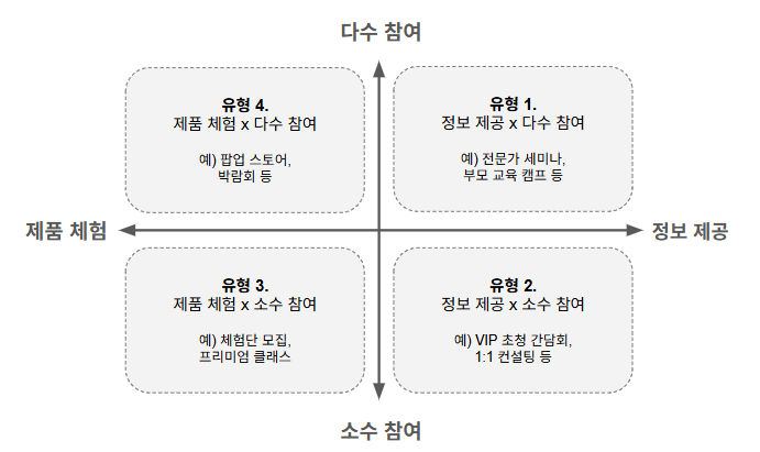 앞선 사례의 신제품 고객 행사 기획에도 이 방식을 적용해 볼 수 있어요. 두 가지 축을 설정해 볼게요. 첫 번째 축은 '제품 체험 중심'과 '정보 제공 중심', 그리고 두 번째 축은 '다수 참여형'과 '소수 집중형'. 이렇게 두 가지 축으로 나누면 아래와 같이 총 네 가지 유형이 도출되어요. 각 유형에 아이디어를 채워 넣으면 일종의 '아이디어 지도'가 완성이 되는 거죠.