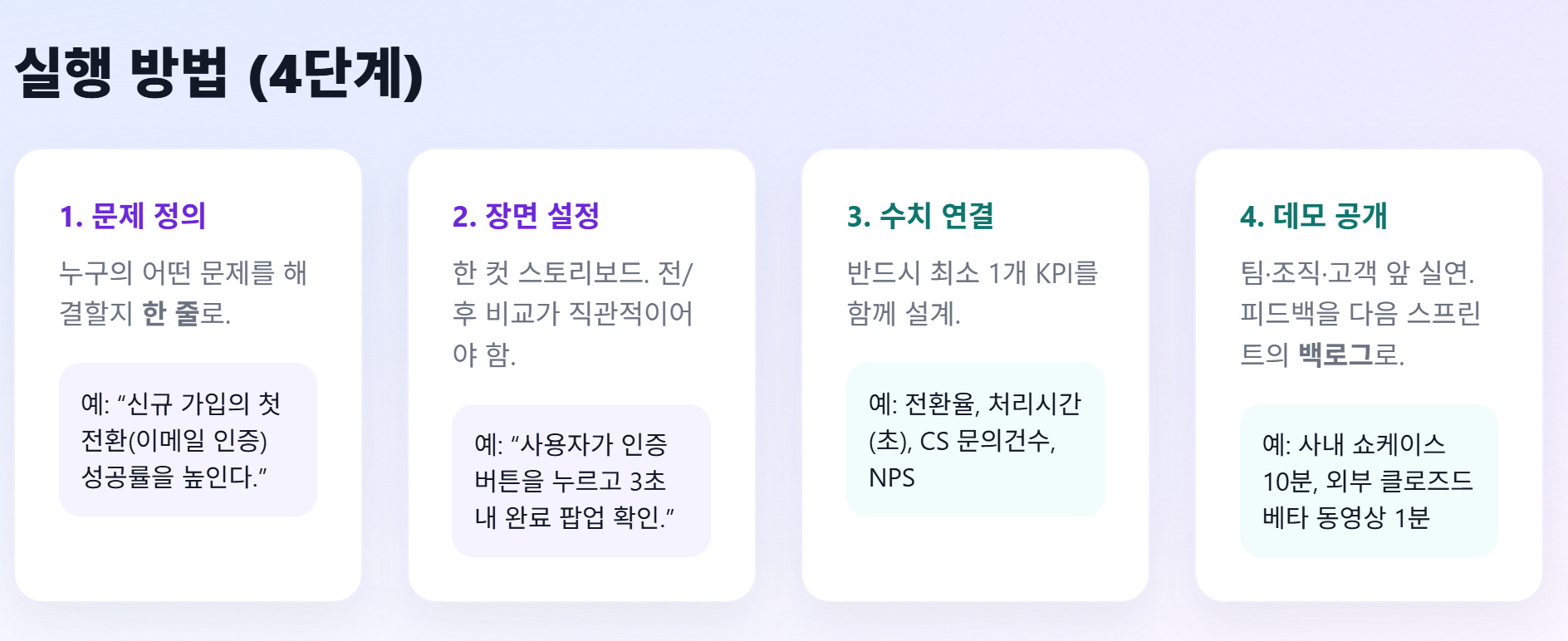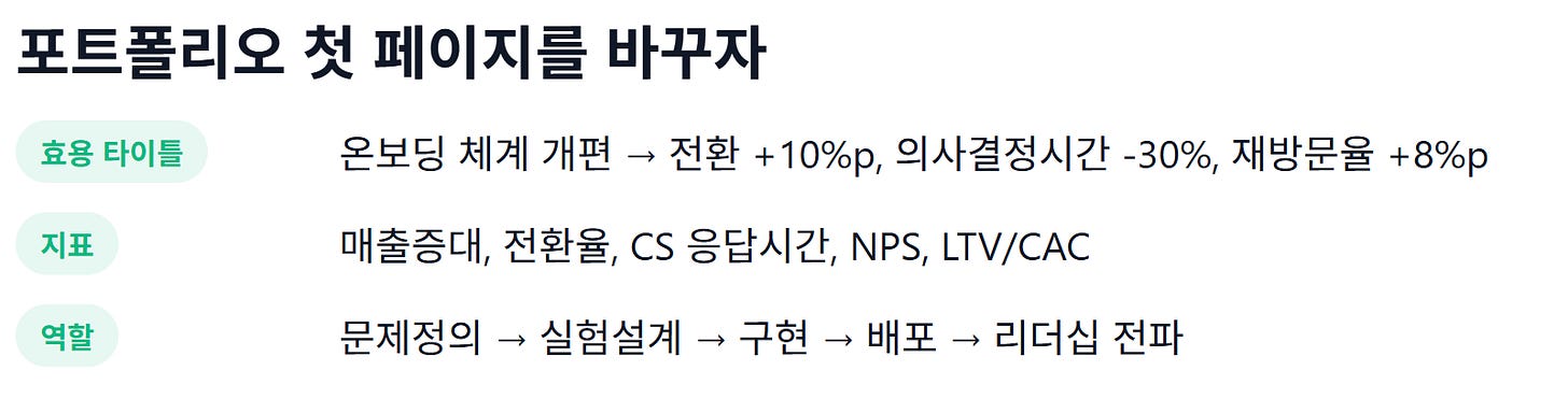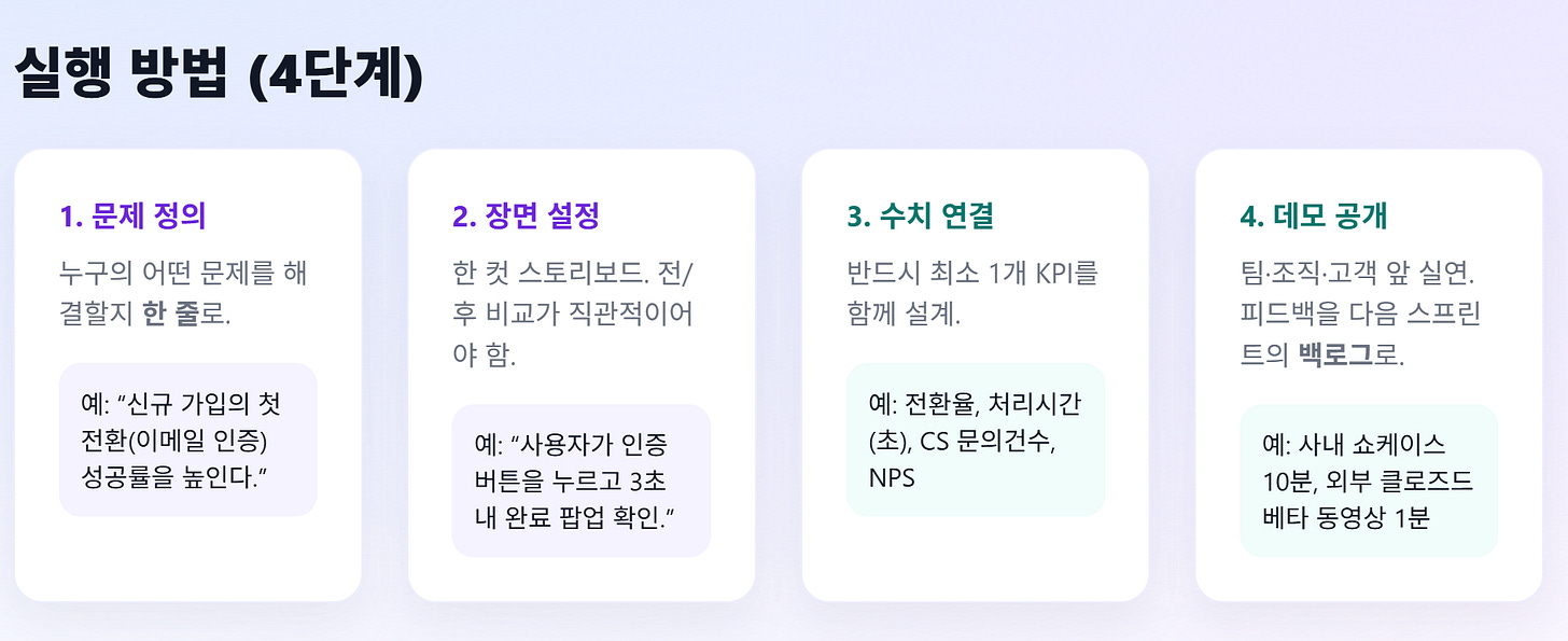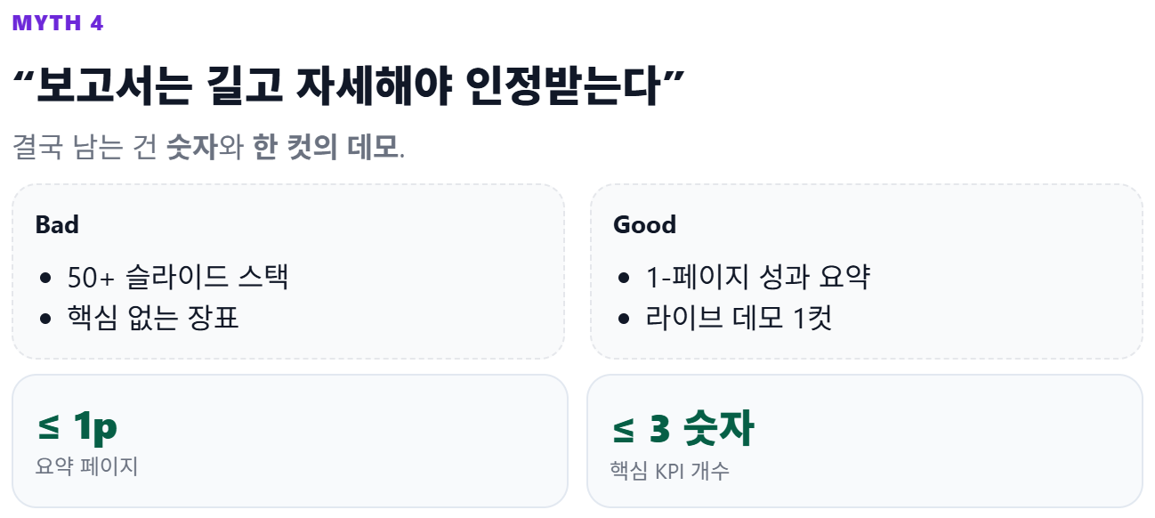 → 상사도 솔직히 긴 보고서를 다 읽지 않는다. 결국 남는 건 숫자와 한 컷의 데모다.