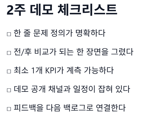 효용은 2주 데모, 니치 해결, 지표와 사례의 타임라인으로 증명된다.