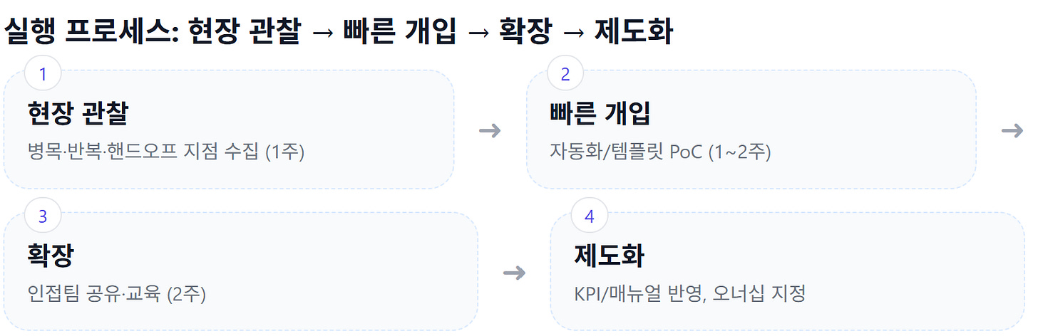 먼저 현장 관찰로 작은 병목을 찾아내고, 빠른 개입으로 자동화나 템플릿을 적용해본다.