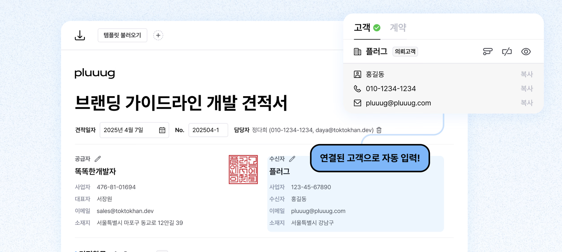 CRM 화면에서 고객 정보를 불러와 견적서를 즉시 작성할 수 있어요.
