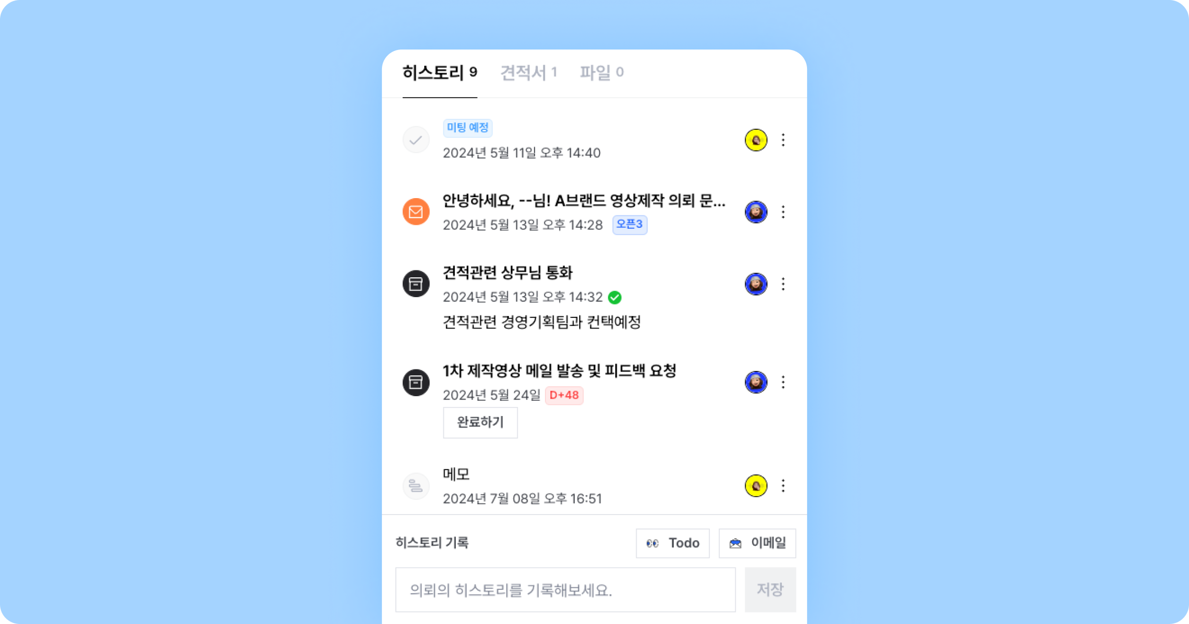 심지어 고객이 회신하면 그 내용도 CRM 히스토리에 함께 저장돼요.