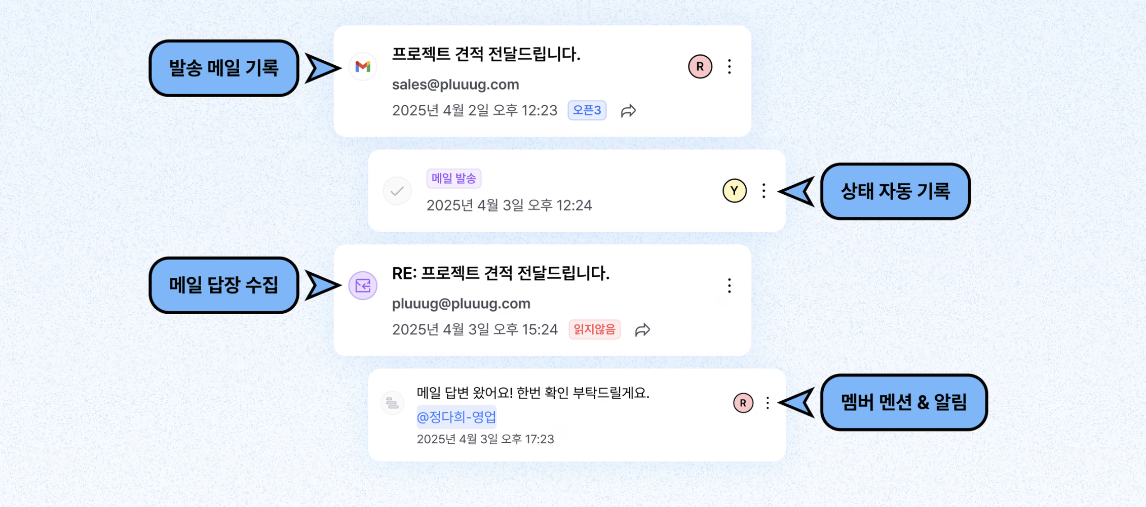 - 편리한 히스토리 관리: 미팅, 이메일 등 모든 소통 내역이 자동으로 쌓여 완벽한 영업관리 이력을 제공해요.
