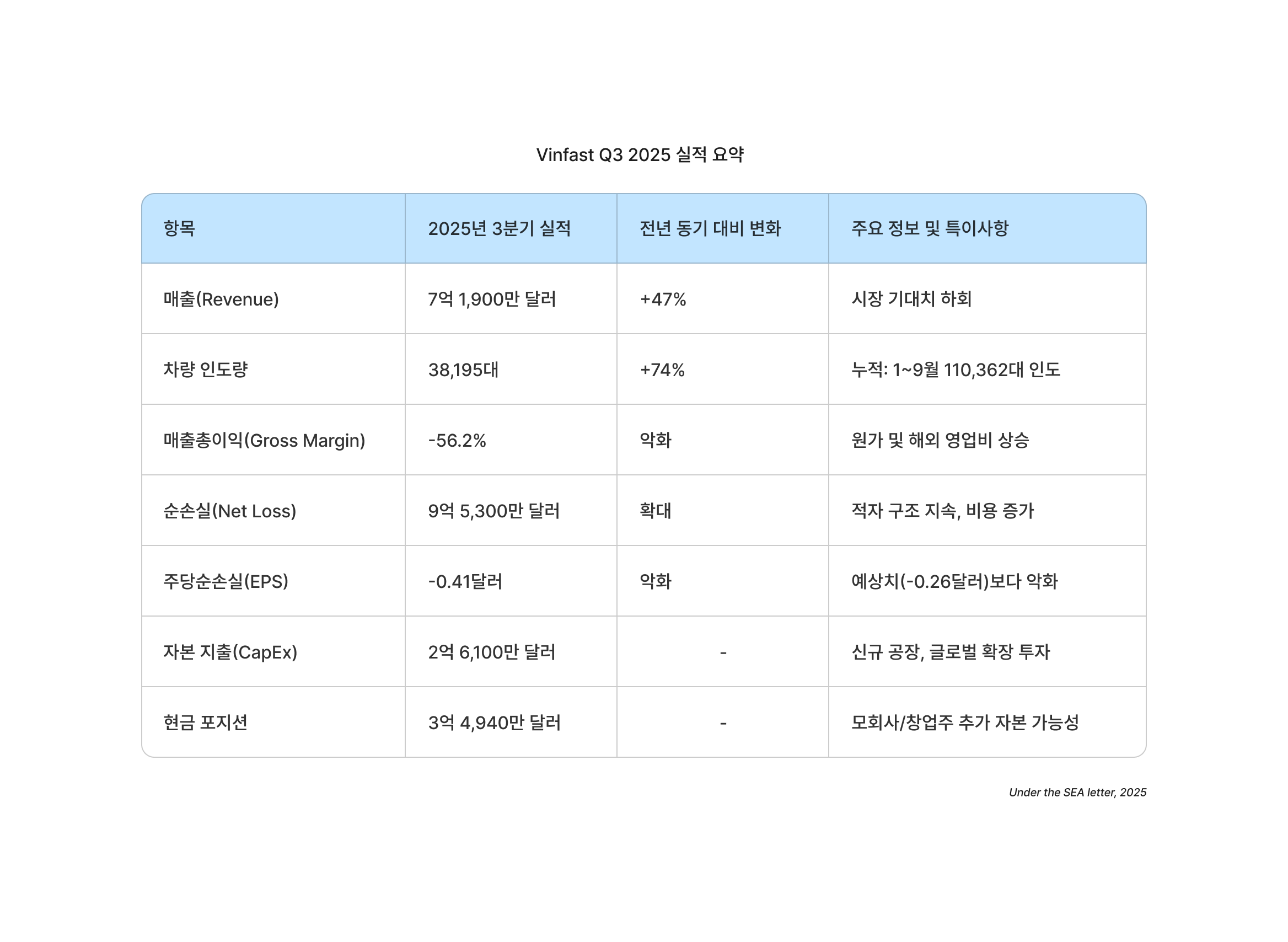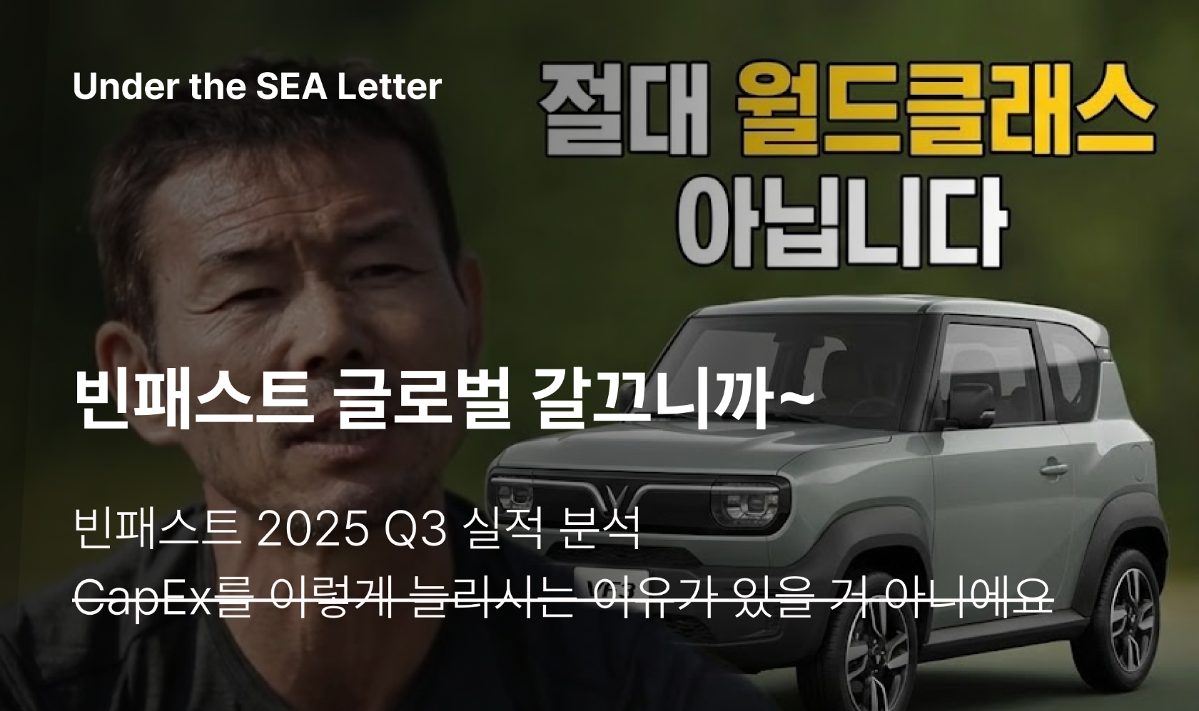 바로 전 뉴스레터에서 다뤘던 빈패스트가 마침 베트남 현지 시간 2025년 11월 21일 20시경 2025년 3분기에 대한 어닝콜을 진행했습니다. 투자의견을 드리진 못하지만... 빈패스트의 방향성과 현황을 엿보기 좋은 어닝콜이라고 생각해 이렇게 가져와보게 되었습니다.