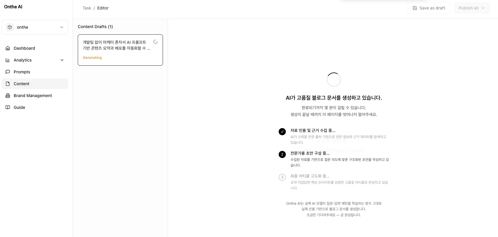 개발자의 도움 없이도 기술적으로 완벽한 GEO 최적화를 구현할 수 있는 것이 Onthe AI의 가장 큰 차별점입니다.