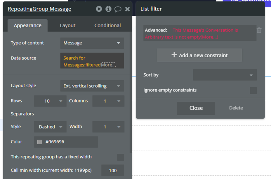 Repeating Group에서 데이터를 필터링할 때 :filtered를 쓰면 편합니다. 하지만 이건 모든 데이터를 다 불러온 다음에 필터링하는 거예요.