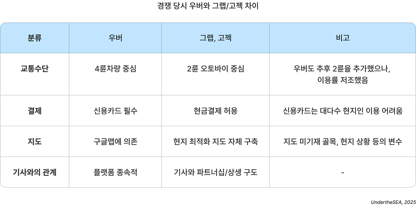 동남아시아는 신용카드 보급률이 낮고, 좁은 골목길에서는 오토바이가 훨씬 효율적입니다. 우버의 ‘글로벌 공식’은 이 지역에서 통하지 않았죠.